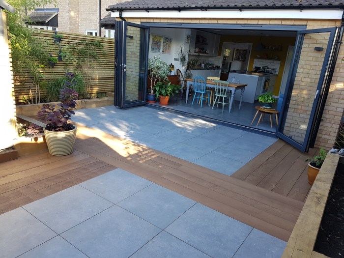 The patchy lawn was waved goodbye and given over to hardscaping in the form of composite decking and tiles which matched exactly the tiles of the kitchen floor. The whole of the outside level was flush with the inside level making a seamless transition to the outside once the bi-fold doors were fully opened up.